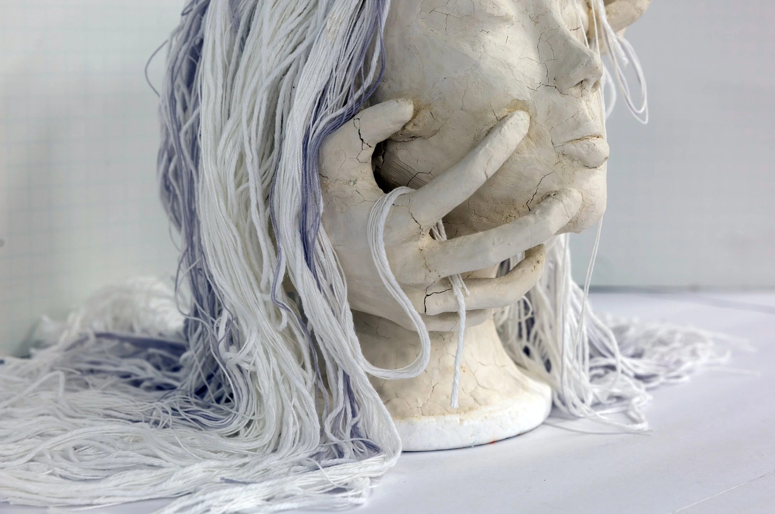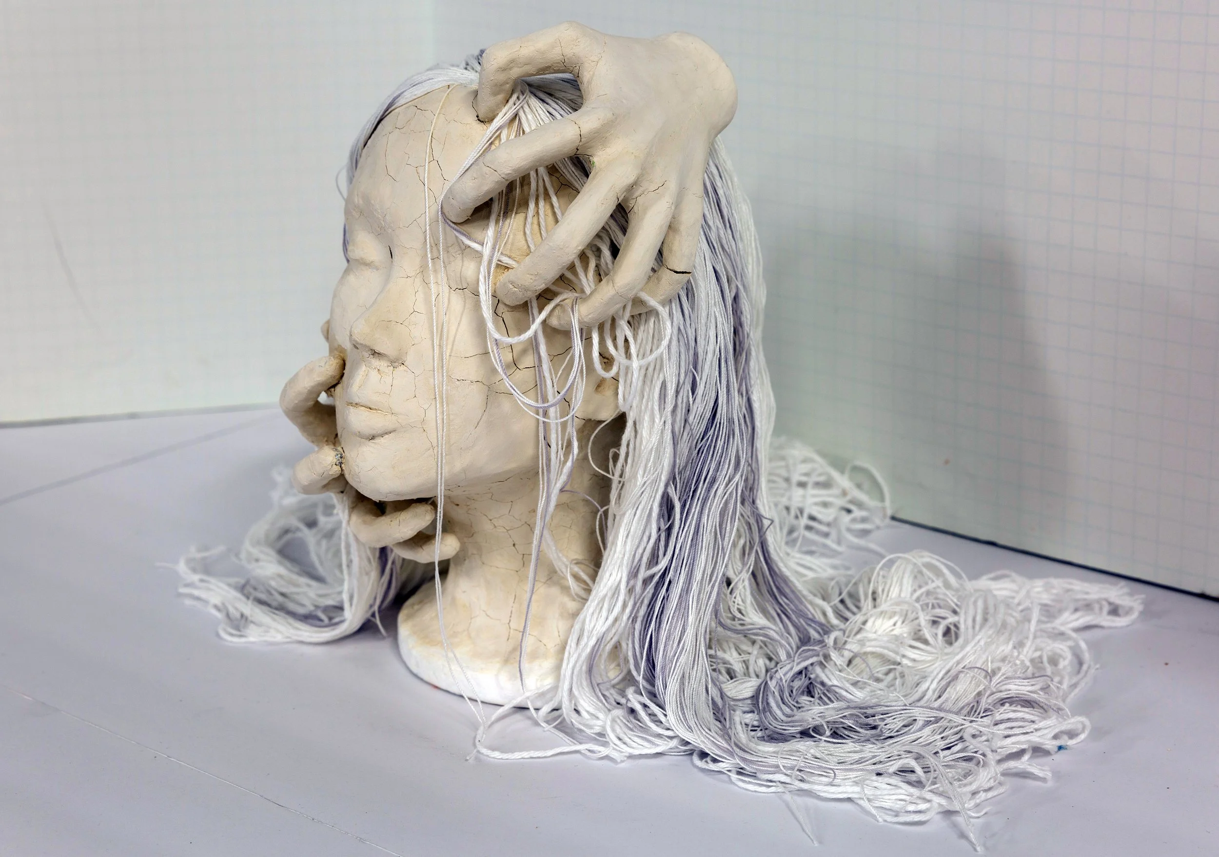 With white hair and a perfect face, the head of a woman represents a pure and innocent self. Hands desperately grasp at the head, portraying greed as they try to contain its purity for themselves. Yet, in the process, these hands ironically destroy it, leaving cracks that run across the face. This forceful, almost obsessive hold degrades, rather than preserves, its beauty.