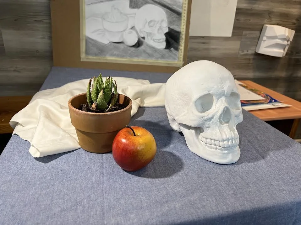 A simple yet captivating still life scene of seemingly miscellaneous items: a succulent plant, an apple, and a skull. The objects are illuminated by soft light, casting subtle shadows that highlight their presence. Behind them, the folds of a draped cloth create a textured background, adding depth to the composition.